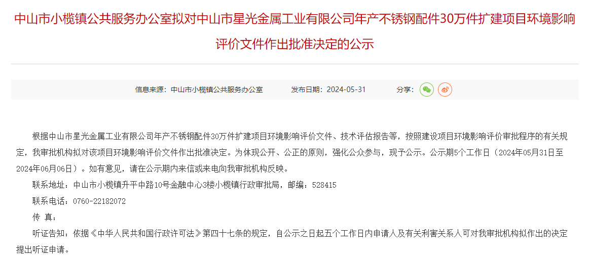5月31日,中山市小欖鎮(zhèn)公共服務(wù)辦公室擬對(duì)中山市星光金屬工業(yè)有限公司年產(chǎn)不銹鋼配件30萬件擴(kuò)建項(xiàng)目環(huán)境影響評(píng)價(jià)文件作出批準(zhǔn)決定并對(duì)外進(jìn)行公示,公示期:5個(gè)工作日(2024年05月31日至2024年06月06日)。